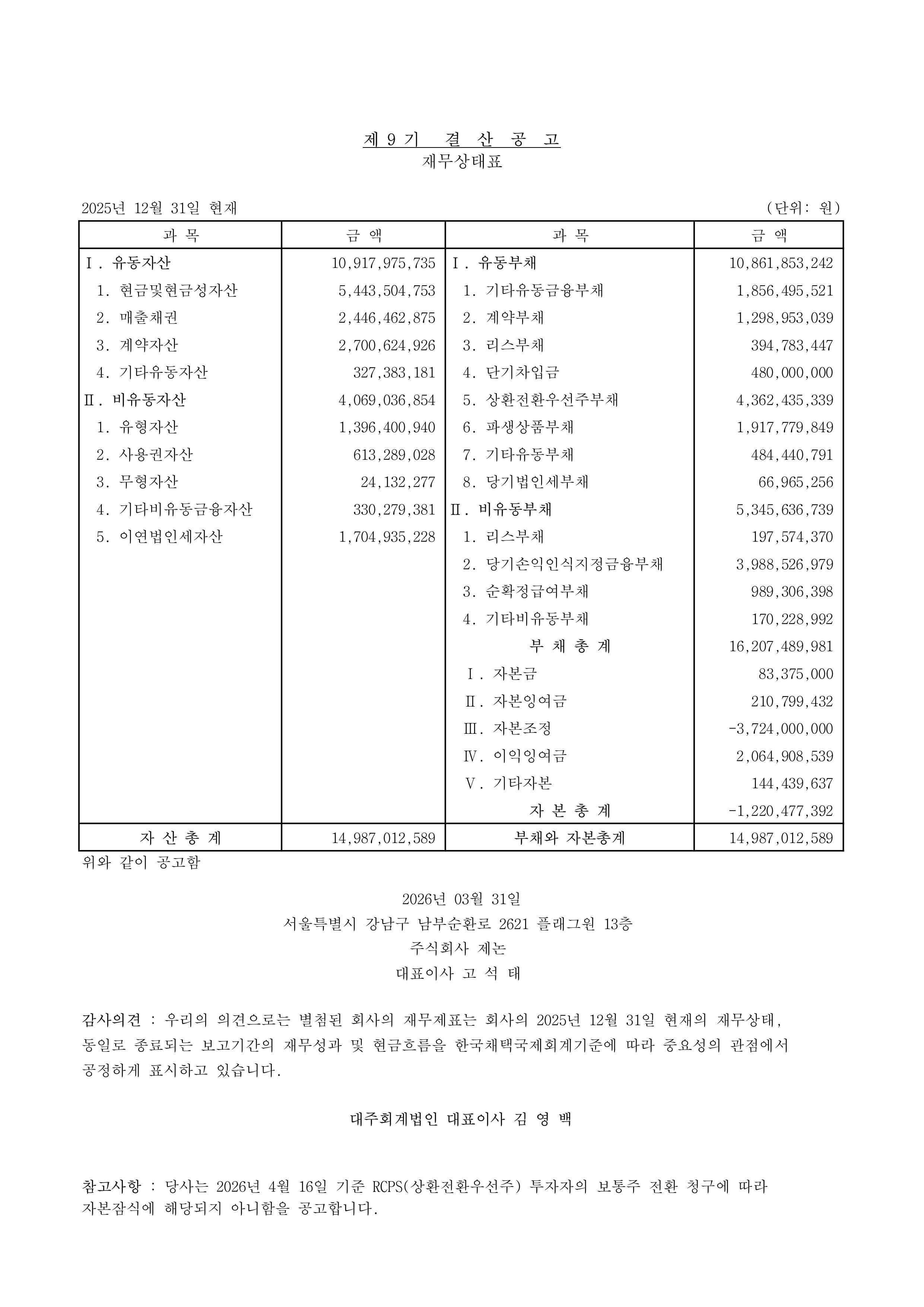 제9기(2025회계연도) 결산 공고