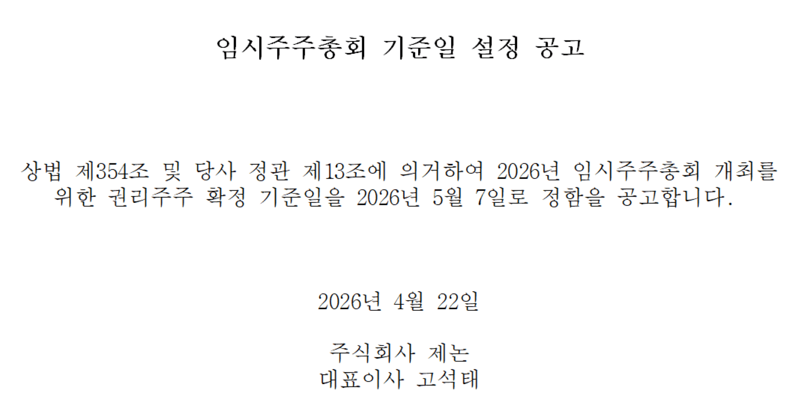 무상증자 권리주주 확정을 위한 기준일 설정 공고