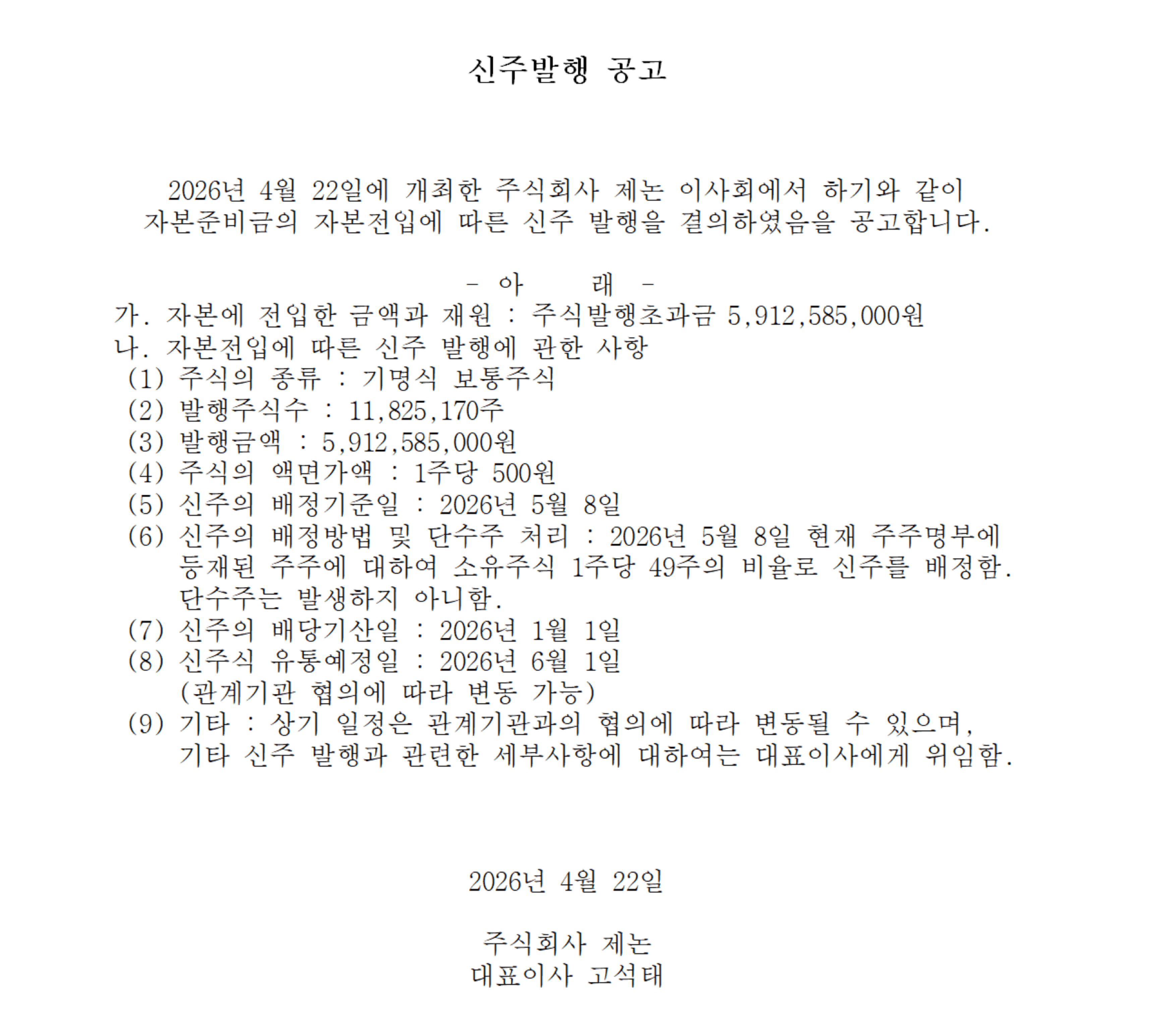 무상증자 권리주주 확정을 위한 기준일 설정 공고